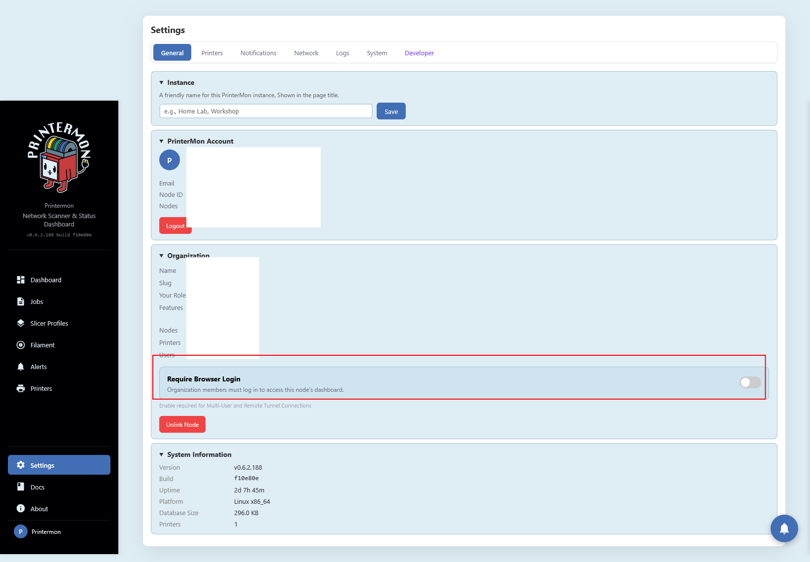 Secure your local PrinterMon node. This is an optional feature left that way because some of you will want to be able to visit a URL and see everything immediately while some of you will want to secure this node on your network, and enable features like remote access or multi-user things.