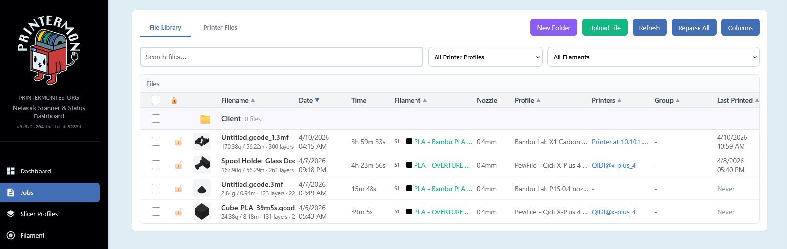 Store all your sliced files in a centralized library with full metadata extraction. PrinterMon automatically parses slicer info, print time estimates, filament usage, layer height, and temperatures from OrcaSlicer, Bambu Studio, PrusaSlicer, and Cura files. Thumbnails are extracted and displayed. Organize files into folders, tag them, lock important ones, and start prints or queue jobs directly from the library.